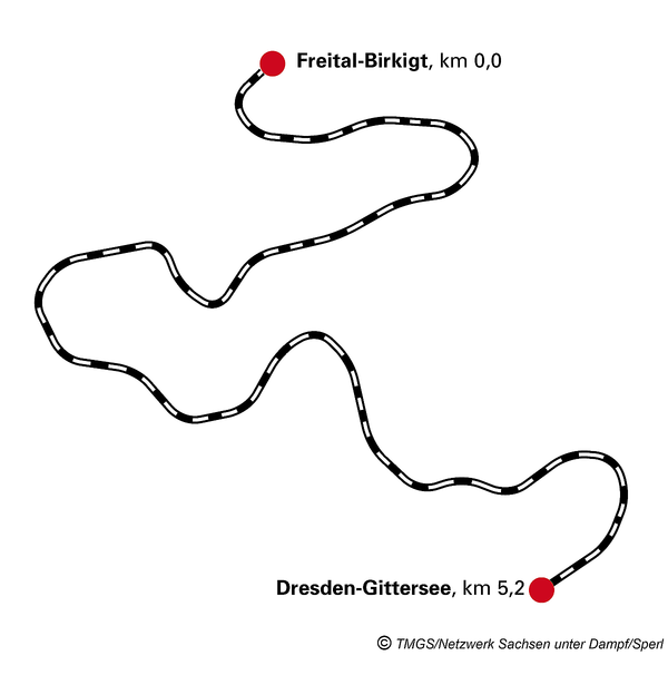 Windbergbahn – Sächsische Semmeringbahn®Freital-Birkigt – Dresden-GitterseeDie erste sächsische Gebirgsbahn – Sächsische Semmeringbahn genanntIn den 1850er Jahren sollten die Steinkohlenzechen in Obergittersee, dem Windberggebiet und der Hänichener Flur über eine Zweigbahn an die Albertbahn Dresden – Tharandt angeschlossen werden. Die Herausforderung bestand darin, auf nur 1,6 km Luftlinie einen Höhenunterschied von 120 m zu überwinden. Die bis 1856 gebaute Bahn war die erste Strecke im heutigen Deutschland, der das gelang und gilt damit als erste deutsche Gebirgsbahn. Europaweit war diese nach der österreichischen Semmeringbahn die zweite derartige Strecke. Dies begeisterte den begeisterten sächsischen König derart, dass er 1857 von der „Sächsischen Semmeringbahn“ sprach und somit der Bahn einen Beinamen gab. Besser bekannt ist sie als Windbergbahn – und das nicht nur, weil eine Teilstrecke direkt zum Windberg führte, sondern weil der Berg ein Wahrzeichen der Region ist.