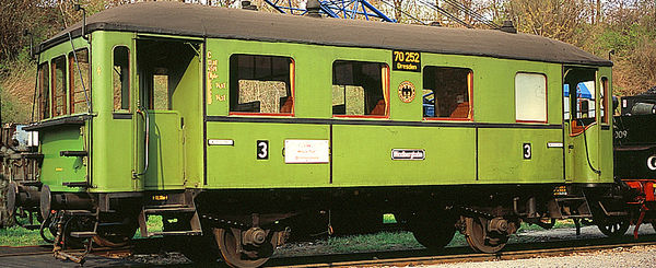 ![]() Fahrzeuge der Windbergbahn – Sächsische Semmeringbahn®Personenwagen Da die anfangs eingesetzten Personenwagen mit ihren schmalen Fenstern bei den Ausflüglern nicht sehr beliebt waren, gingen die Reisendenzahlen leicht zurück. Daraufhin ließen die Königlich Sächsischen Staatseisenbahnen in Bautzen vier neuartige Personenwagen bauen und nahmen diese am 1. Mai 1912 (Fahrplanwechsel) feierlich in Betrieb. Die sogenannten Windbergwagen oder Aussichtswagen der DRG-Gattung C Sa 12 (im sächs. Wagenverzeichnis Blatt lfd. Nr. 140a) waren an die besonderen Verhältnisse angepasst. Sie besaßen Lenkachsen mit 4,50 m Achsstand, Westinghouse-Druckluftbremse, Dampfheizung, Gasbeleuchtung, Großraumabteil und auffallend breite Fenster (siehe technische Daten). Die Wagenbühnen (Perrons) waren überdacht. An den geschlossenen Stirnseiten befanden sich Sitzbänke. Mit den Meyer-Loks der Baureihe 980 bildeten die Aussichtswagen jahrelang das typische Bild der Personenzüge auf der Windbergbahn Wagengattung DRG-Skizzenblatt C Sa 12 (sächs. lfd. Nr. 140a) Historie WindbergbahnDer Bau der zunächst – entsprechend ihrer vorrangigen Bestimmung – als „Hänichener Kohlenzweigbahn“ bezeichneten Bahnlinie begann im April 1856 durch die Albertbahn-Aktiengesellschaft. Bei einer persönlichen Befahrung bis Hänichen am 15. April 1857 bezeichnete der sächsische König Johann in Begeisterung über die spektakuläre Streckenführung die neue Eisenbahn als „Sächsische Semmeringbahn“. Die in der Tat herrlichen Ausblicke dieser ersten deutschen Gebirgsbahn veranlassten die Bahngesellschaft dann erstmals am 10. Mai 1857, spezielle „Aussichtsfahrten“ für die Öffentlichkeit anzubieten, wobei – in Ermangelung geeigneter Wagen – die Beförderung der Ausflügler in mit grünen Zweigen dekorierten Kohlewagen stattfand. Nach reichlich 14 Jahren wurden diese Fahrten aus Gründen der Sicherheit vom neuen Eigentümer, den Königlich Sächsischen Staatseisenbahnen (K.Sächs.Sts.E.B.), unterbunden. Mit dem Rückgang des Kohlenabbaus befürchteten die Gemeinden Hänichen und Rippien sowie das angrenzende Possendorf eine starke Abwanderung der Bevölkerung. Um dies zu verhindern, wurde 1891 bei der Landesregierung eine Petition eingereicht mit dem Ziel, die Bahn für öffentlichen Personen- und Güterverkehr zu öffnen und bis Possendorf zu verlängern. Am 30. September 1908 wurde schließlich die 1,1 km messende Verlängerung bis Possendorf feierlich eröffnet. Von 1910 bis 1914 beschafften die K.Sächs.Sts.E.B. insgesamt 18 eigens für die anspruchsvoll trassierte Windbergbahn konstruierte Lokomotiven der sächsischen Gattung I T V, die wegen ihrer auffälligen Bauform von der Bevölkerung bald den Spitznamen „Possendorfer Heddel“ erhielten. Im Jahr 1912 lieferte die Waggonfabrik Bautzen die vier „Windberg-Aussichtswagen“, die fortan das Bild der Bahn bis zur Einstellung des Reiseverkehrs prägten und mit ihren für damalige Verhältnisse großen Fenstern wesentlich zum Aufschwung im Ausflugsverkehr beitrugen. Nach dem letzten Personenzug am 9. November 1957 diente die Bahn ausschließlich dem Güterverkehr. Die zur Gewinnung von Uranerz betriebene Erzwäsche in Dresden-Coschütz sorgte bis 1962 für erhebliches Transportaufkommen, ab 1963 wurde in Dresden-Gittersee als Nebenprodukt Erzkohle (Uranerz) abgebaut, das per Bahn abtransportiert werden musste. Die bereits 50 Jahre alten und seit 1925 als Baureihe 98.0 bezeichneten Windbergloks waren zwischenzeitlich verschlissen und wurden bis 1967 durch Rangierloks vom Typ V60D abgelöst. Im gleichen Jahr wurde die Strecke von Dresden-Gittersee bis Kleinnaundorf stillgelegt. Im Laufe der folgenden Jahre geriet die Bahn immer mehr in Vergessenheit, erst 1980 mit Gründung der AG 3/82 „Windbergbahn“ im DMV begann mit Bergung des letzten „Windberg-Aussichtswagens“ die gezielte Vereinsarbeit zur Bewahrung der inzwischen als Technisches Denkmal eingestuften Windbergbahn. |