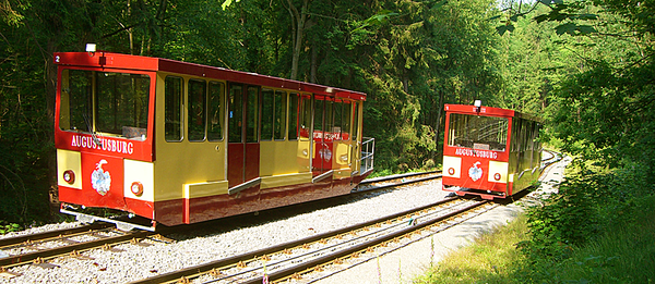 Auf Draht zum Schloss AugustusburgWenn von sächsischen Kurfürsten die Rede ist, denken alle an August den Starken. Nur wenige kennen August Herzog von Sachsen, den man auch Vater August nannte. Geboren 1526 in Freiberg, war er einer der Wettiner, die Sachsen wesentlich prägten. Unter anderem setzte er sich mit dem Bau von Schloss Augustusburg ein bleibendes Denkmal. Heute ist Schloss Augustusburg mit dem Motorrad- und Kutschenmuseum, dem Museum für Jagdtier- und Vogelkunde sowie der Jugendherberge weit über Sachsen hinaus bekannt. Vom Zschopautal aus bis zum Schloss auf dem Schellenberg ist ein Höhenunterschied von mehr als 200 m zu überwinden. Nach der Eröffnung der Eisenbahn im Zschopautal und der Entwicklung des Fremdenverkehrs wurde die bessere Anbindung der Stadt an den in der Nähe gelegenen Bahnhof notwendig. 1911 konnte die Drahtseilbahn Augustusburg mit einer Spurweite von 1000 mm und einer Länge von 1237 m eröffnet werden.